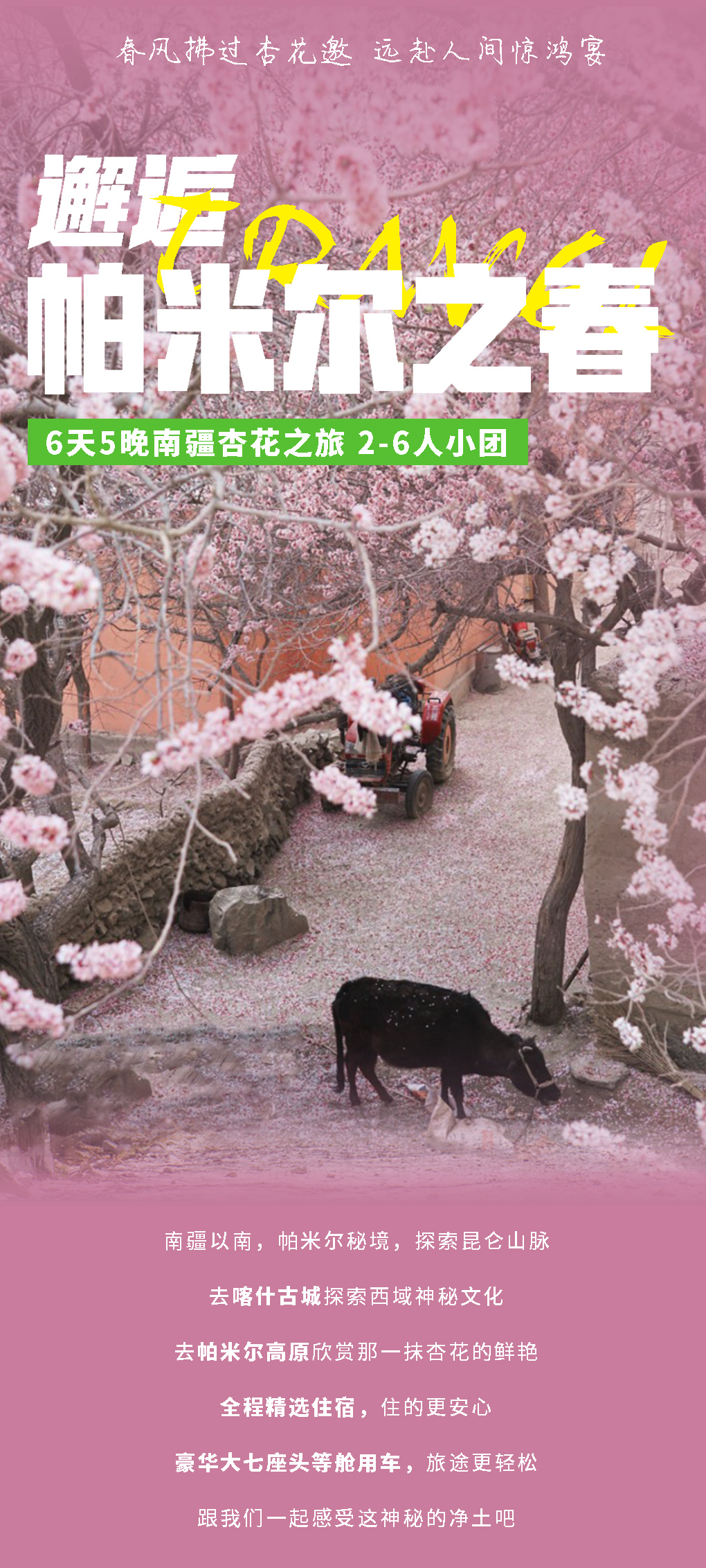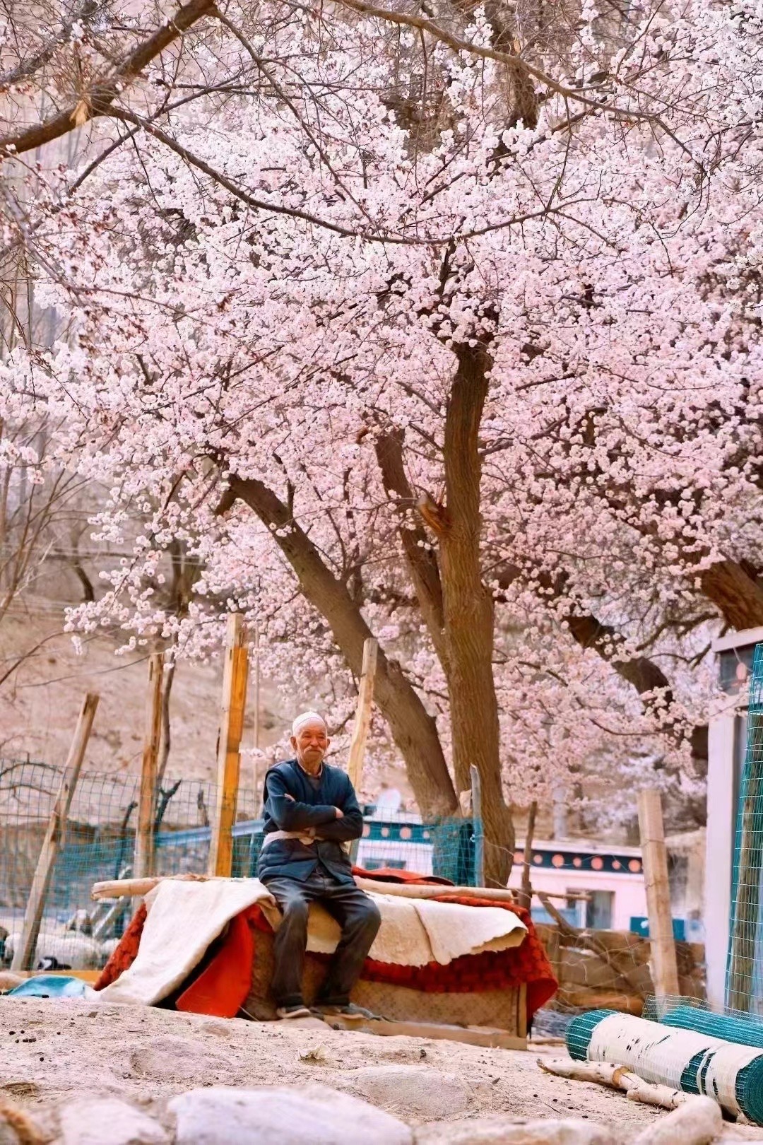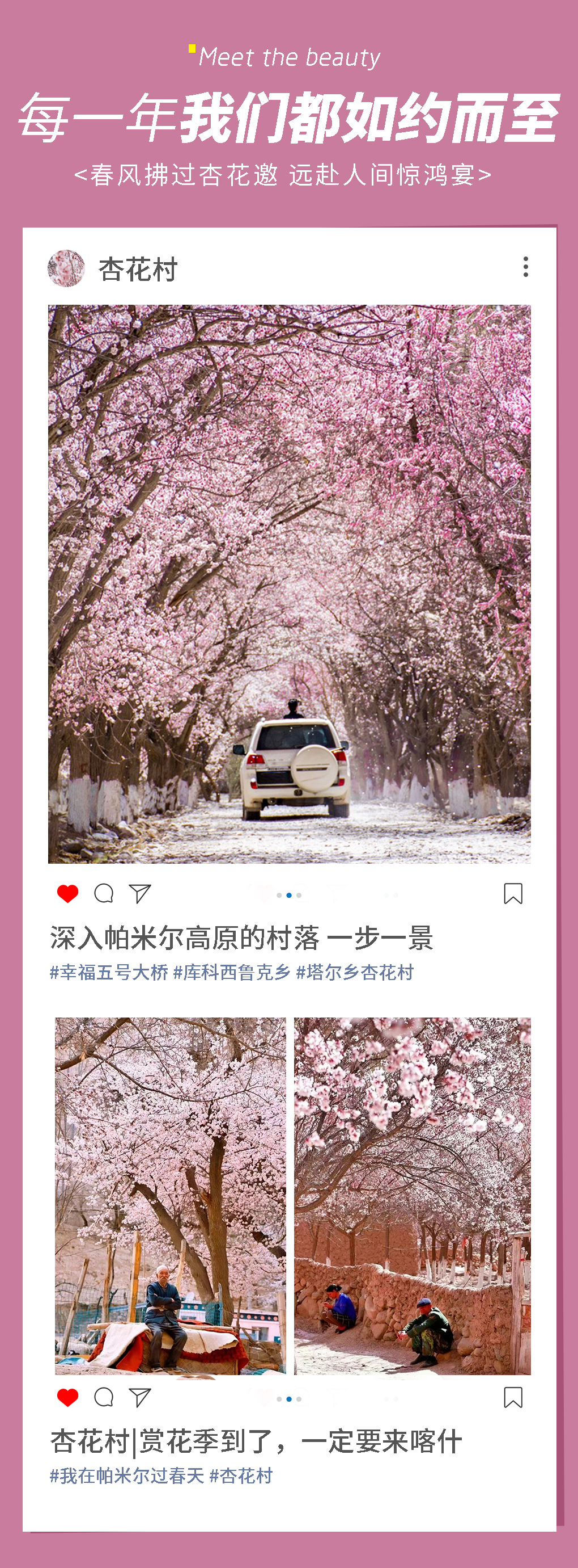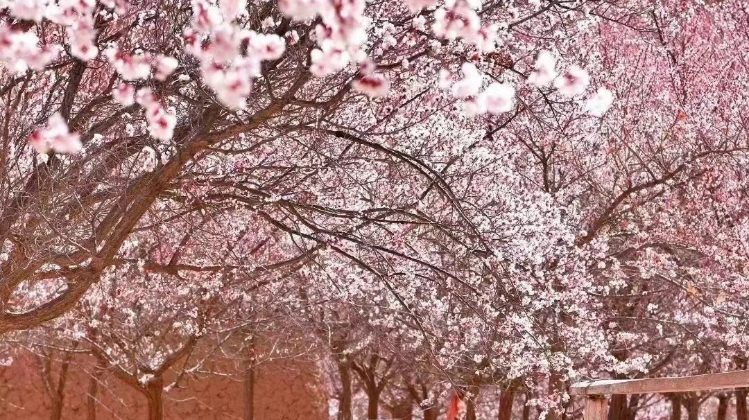 清晨,我们从塔县出发,经塔莎古道翻过蜿蜒的喀拉昆仑山脉与兴都库什山脉前往杏花村。一路的老杏树迎着春风盛放,花瓣曼舞在阳光下,整个村子都充满粉嫩的颜色,仿佛"牧童遥指杏花村"的诗意画面。