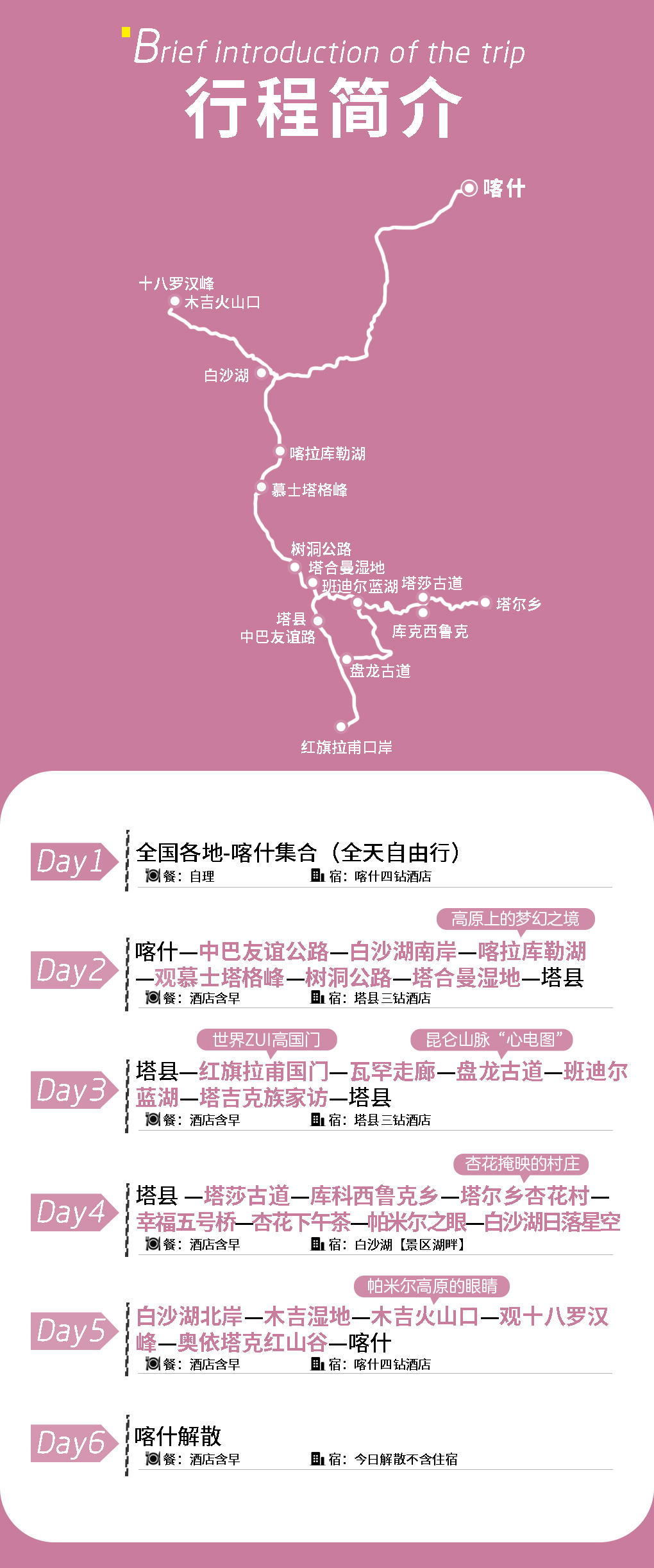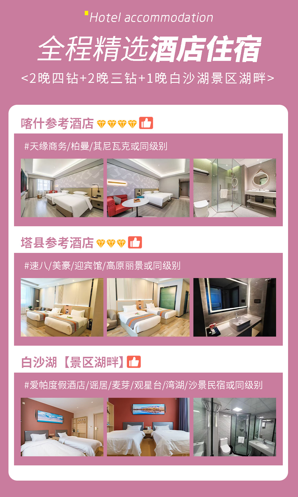 其中2晚喀什4钻,2晚塔县3钻,1晚白沙湖住宿。