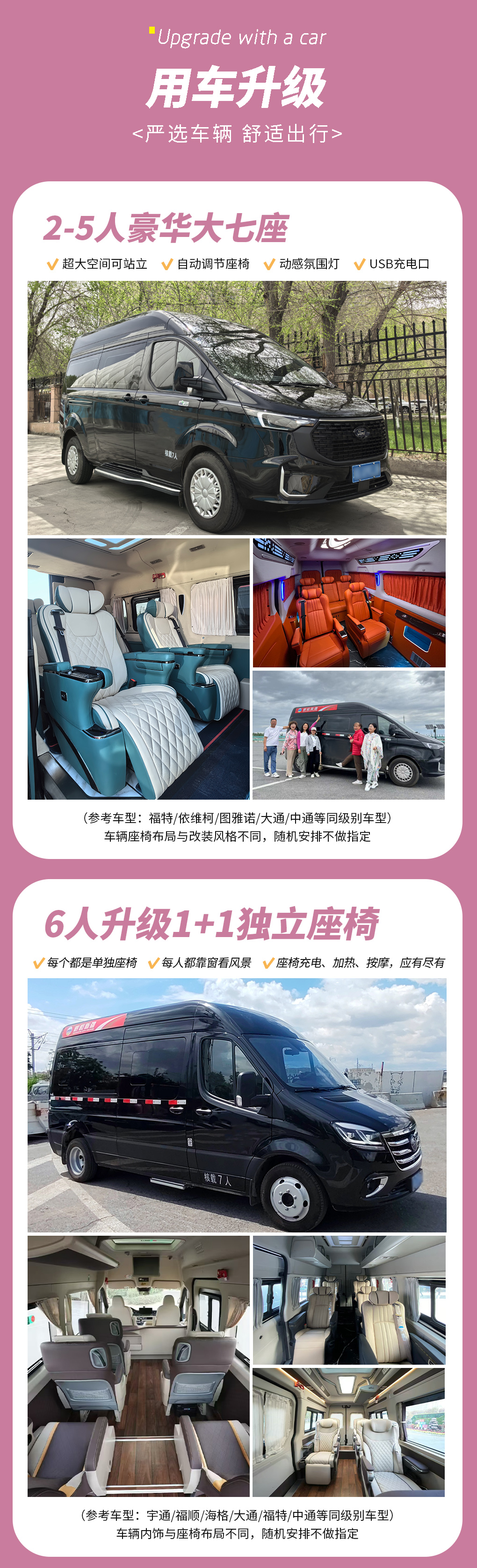 【当地交通】全程4天用车费用。2-5人用高顶大七座商务车,6人升级1+1大七座商务车。(含司机、油费、过路费、停车费,司机食宿)不接受指定车型。拼车全程座位需轮流换座。车辆空间有限,请携带不超过26寸的行李箱。