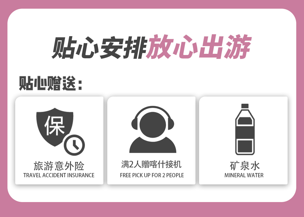 3.到达喀什后自行前往指定酒店入住,办理入住时需要交押金,房费已付,押金自理,报姓名拿房卡。