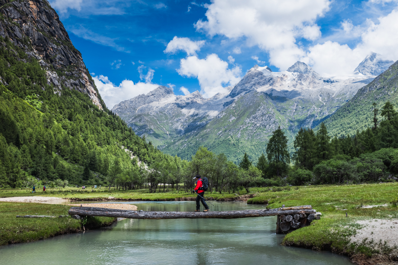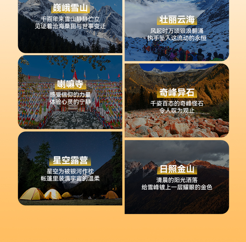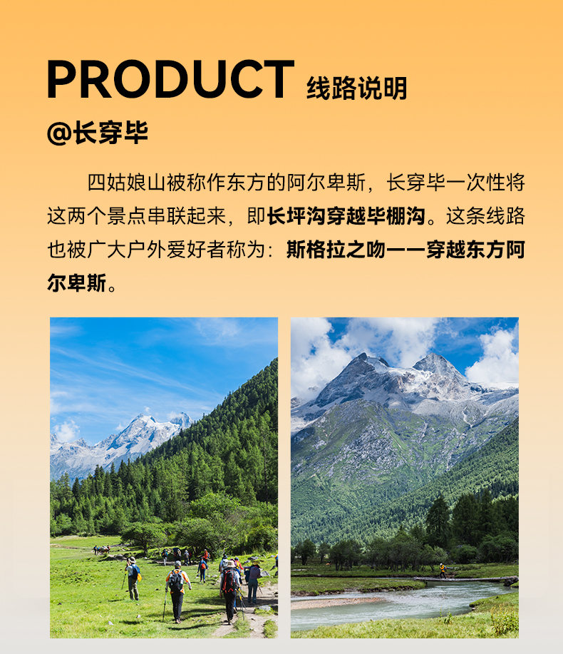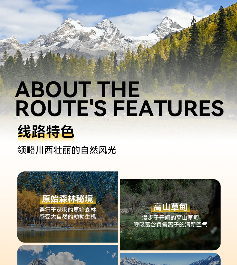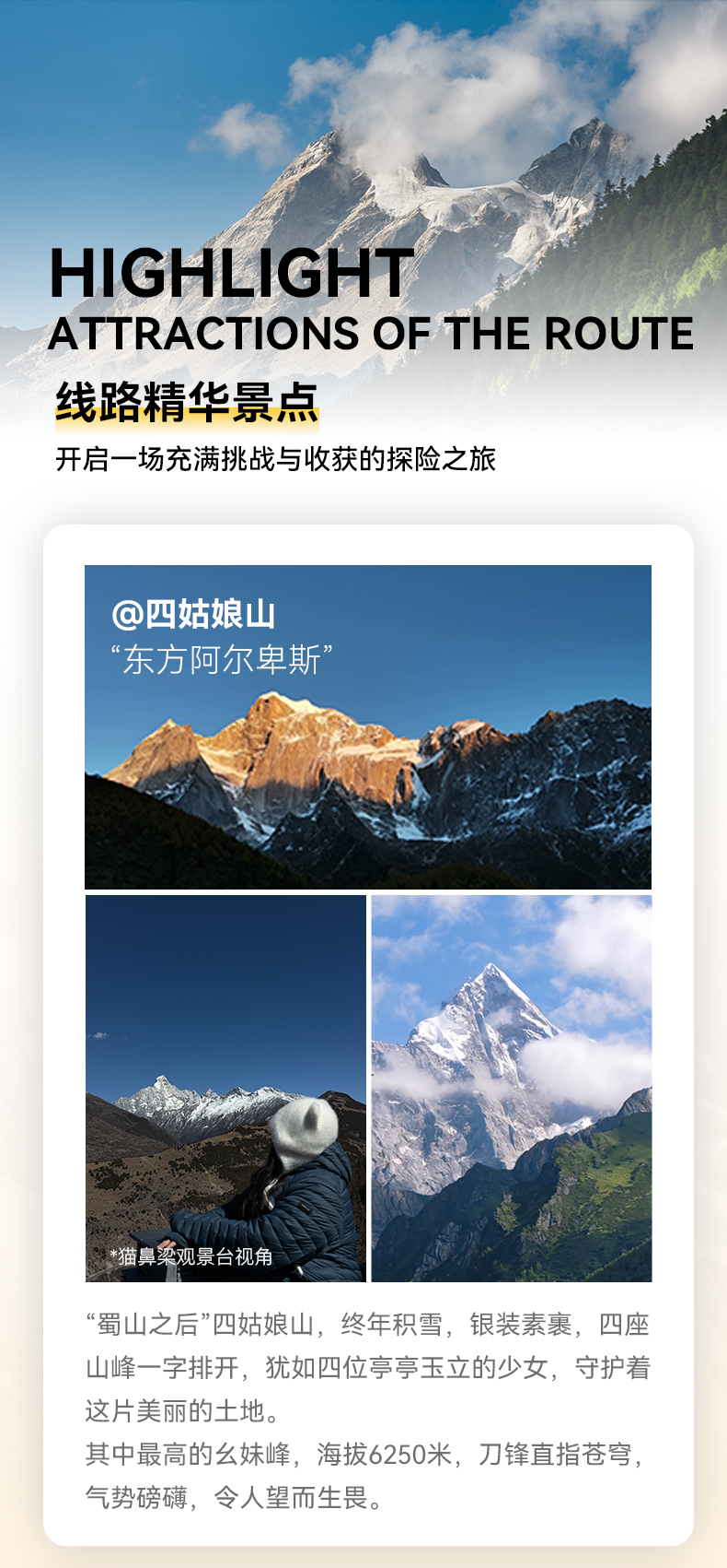 行程概览:早上从集合点出发,途经映秀、卧龙,“熊猫之乡”、“宝贵的生物基因库”、“天然动植物园”——卧龙大自然秀丽风光,顺着盘山公路翻越巴郎山,经猫鼻梁观四姑娘山全景然后抵达长坪沟景区,乘坐景区观光车进入长坪沟,内有古柏幽道、喇嘛寺、干海子及高数十米的飞瀑,并有奇石之景。夏天,山野间鲜花争相盛开;秋日,赤桦与红枫竞艳。历经沧桑的翠柏青松郁郁葱葱,飞瀑流泉在密林中哗哗作响,古代驿路在茫茫林海里穿梭延伸。今天晚上在四姑娘山幺妹峰脚下的木骡子营地露营。