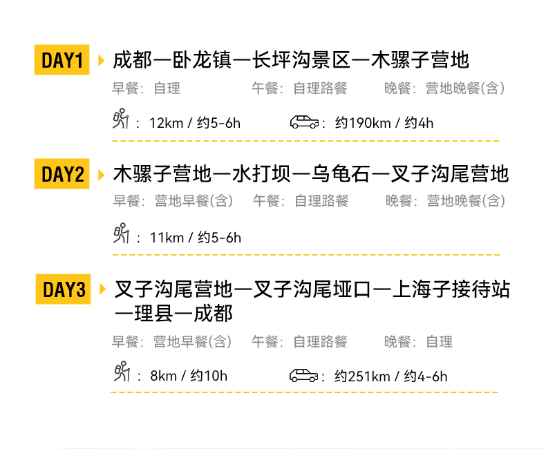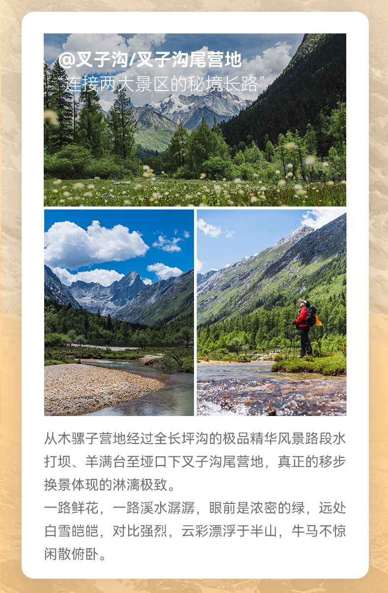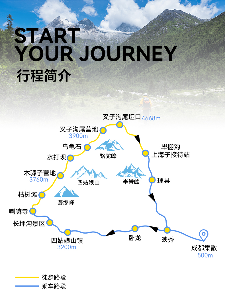 叉子沟尾营地 -(徒步约3.5KM)- 叉子沟尾垭口 -(徒步约4.5KM)- 上海子接待站 -(车程约63KM)- 理县 -(车程约188KM)- 成都