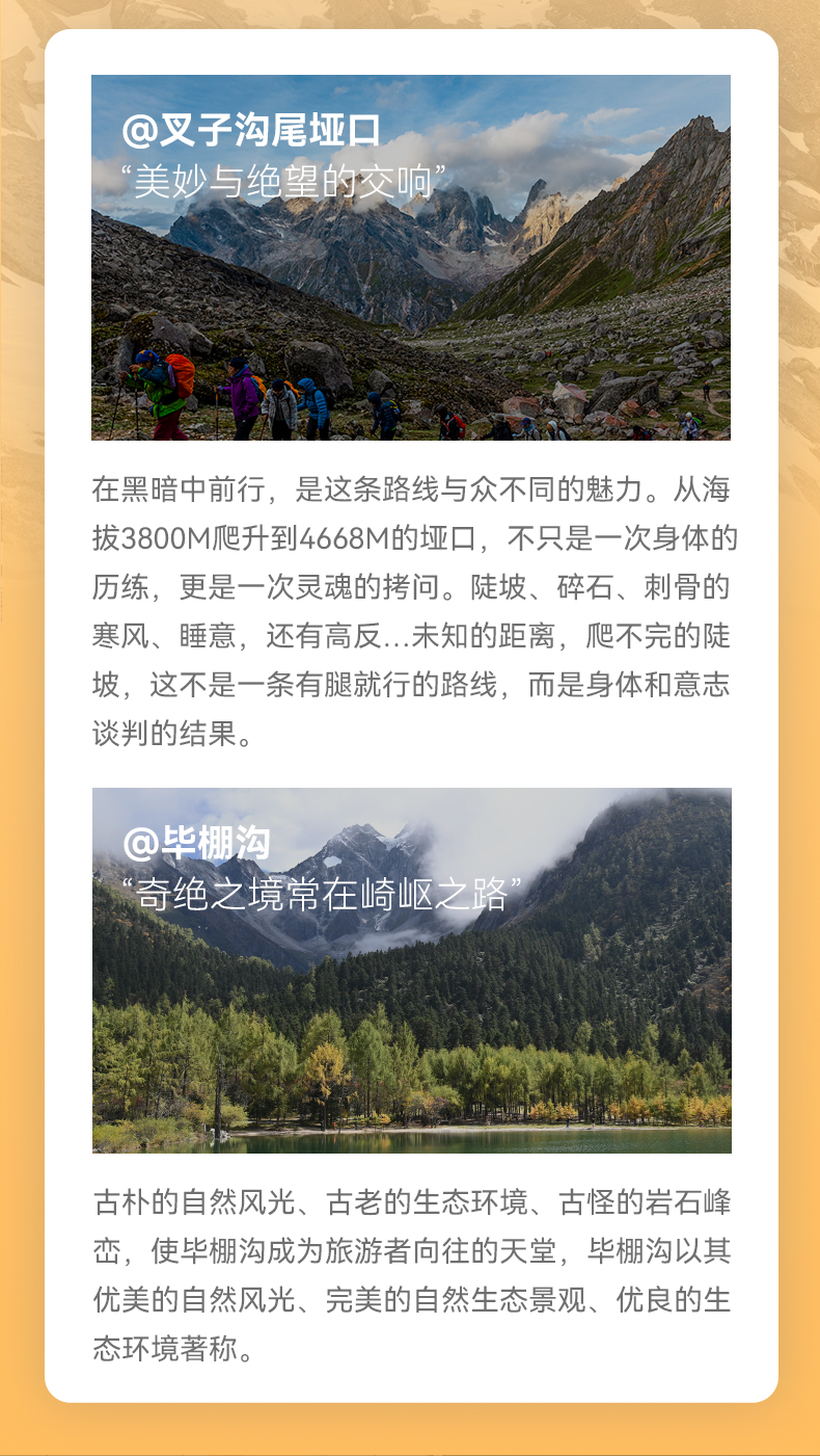 行程概览:今天早起,凌晨3点左右出发,具体根据领队安排时间为准,今天体力要求相对较大,大家做好准备从营地到垭口大约3km,开始的一段路非常陡峭,需要倍加小心,后面坡度稍缓一些,在经过一个大平台之后,垭口就在眼前了,翻越4600米以上的叉子沟垭口,运气好的话在这里可以看到沟内翻滚的云海及佛光,然后一路下坡来到毕棚沟内的三棵树营地,之后就是毕棚沟的大路了,一路的景色也非常棒,抵达公路边的磐羊湖休息站,等待后面的队员到来,一起乘坐景区电瓶车来到上海子接待站,在此乘坐景区观光车抵达毕棚沟大门,到达景区大门,乘上早已等候我们的车子,当天抵达成都。