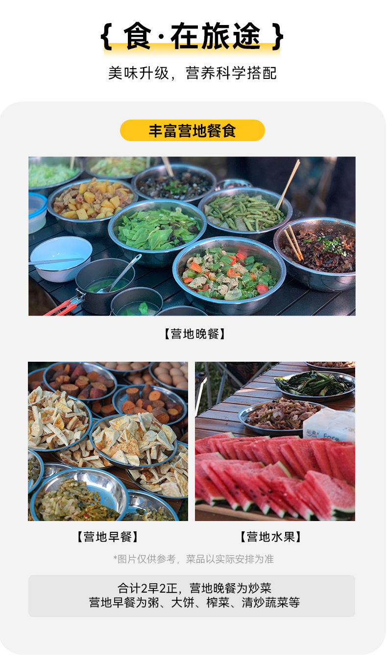 3.餐食:全程所列餐食合计2正2早,包含营地早餐、晚餐。营地晚餐为四菜一汤,营地早餐为粥、大饼、榨菜、清炒蔬菜等。