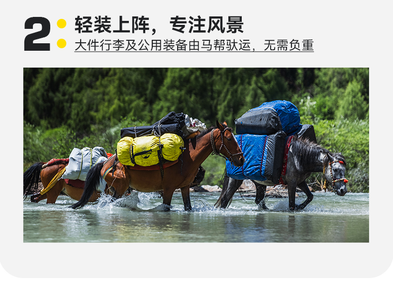 5.个人装备驮运不能超过15公斤。超重需提前告知,并酌情补足行李超重费用,以便我们增加驮运马匹。