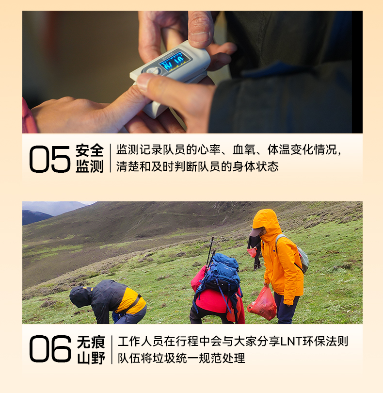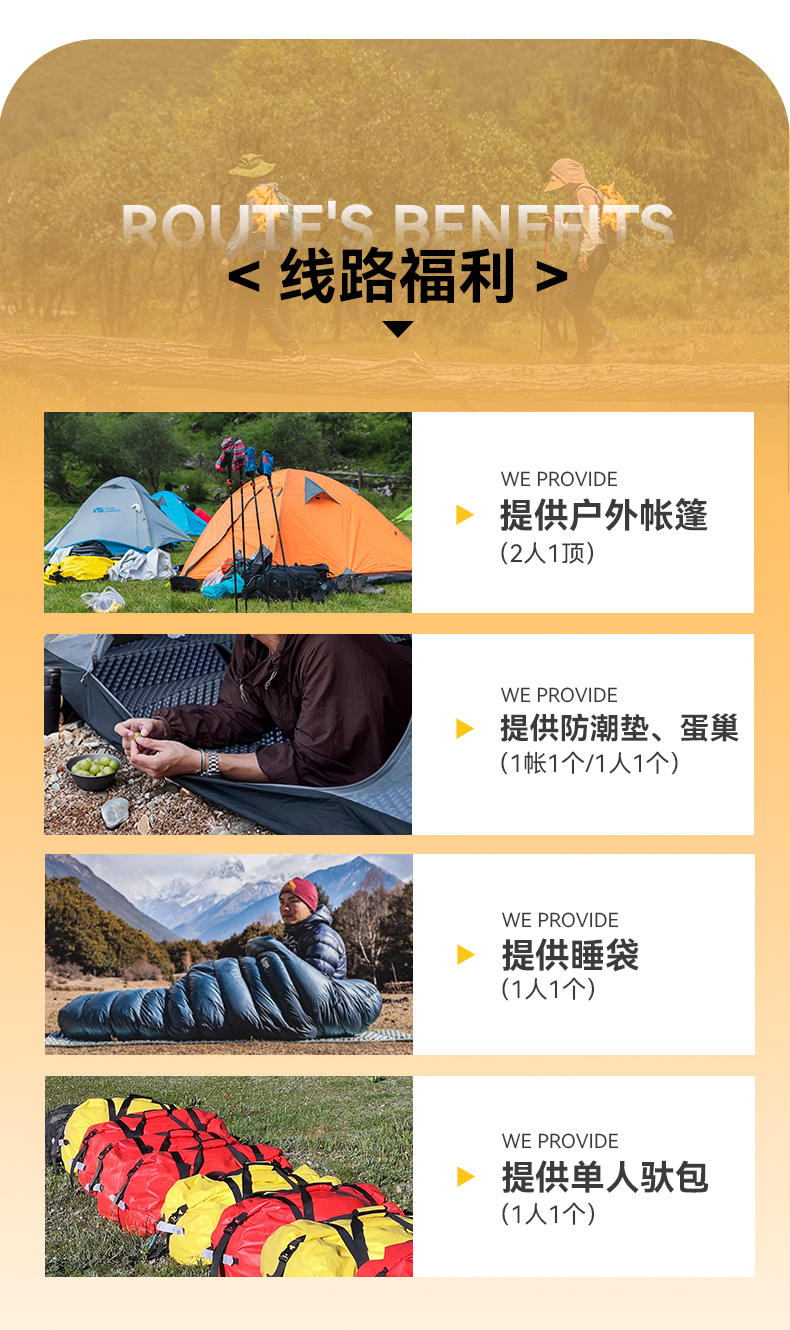 6.装备:①提供帐篷、防潮垫、蛋巢垫;②燃料、炊具、部分餐具、通讯工具等。
